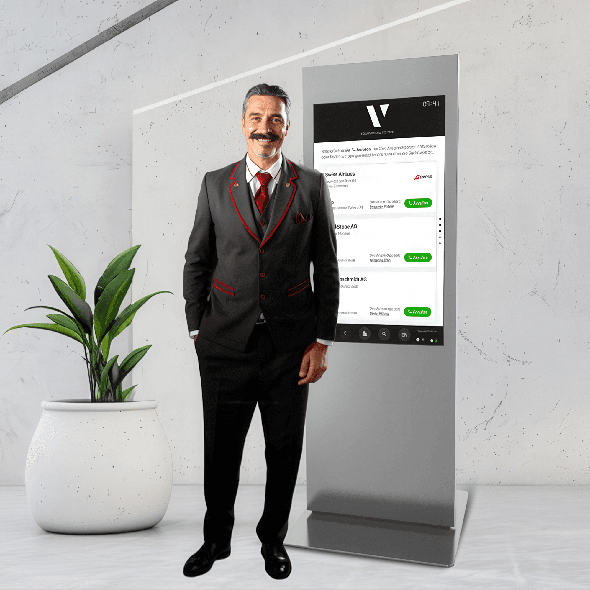 “ Der virtuelle Portier wurde entwickelt, um Unternehmen jeder Grösse die Möglichkeit zu geben, ihren Gästen ein erstklassiges Erlebnis mit modernster Technologie und unübertroffener Effizienz zu bieten. Vereinbaren Sie einen Termin für eine Vorführung mit mir, und ich werde Ihnen die Lösung zeigen, die wir über 10 Jahre hinweg perfektioniert haben. ”